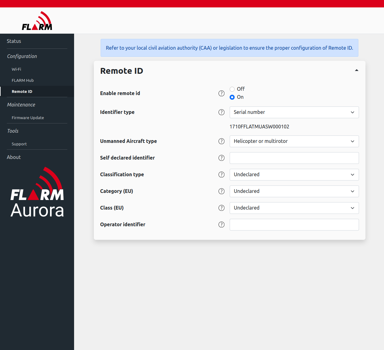 The detailed configuration of RemoteID, such as the declared classification type, category or class can be set under ‚Configuration‘->’Remote ID‘.